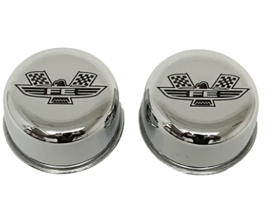 This is a set of chrome valve cover breathers featuring a laser engraved Ford FE American Eagle logo with text.