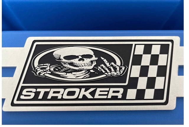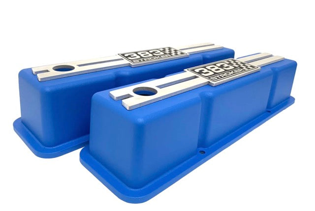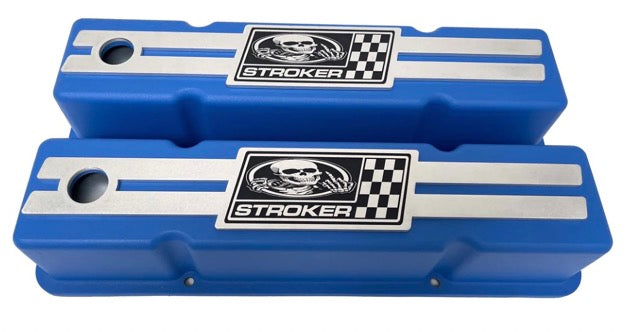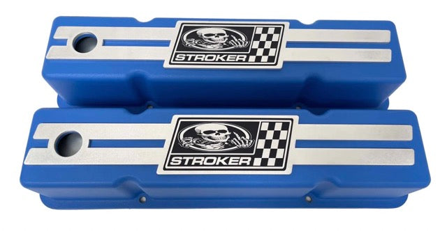 This set of custom Small Block Chevy Tall Blue valve covers feature a new custom engraved billet top engraved with a "Skeleton Stroker" logo. USA valve covers are made from high-grade die-cast aluminium and we take great pride in saying they're Made in the USA!